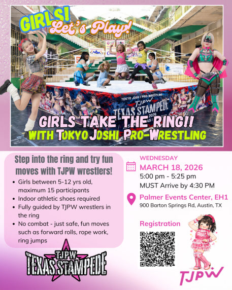 Girls Take the Ring is a free, fully guided mini ring experience for girls ages 5–12, held as part of TJPW Texas Stampede – Austin Day 2 with Tokyo Joshi Pro Wrestling.
