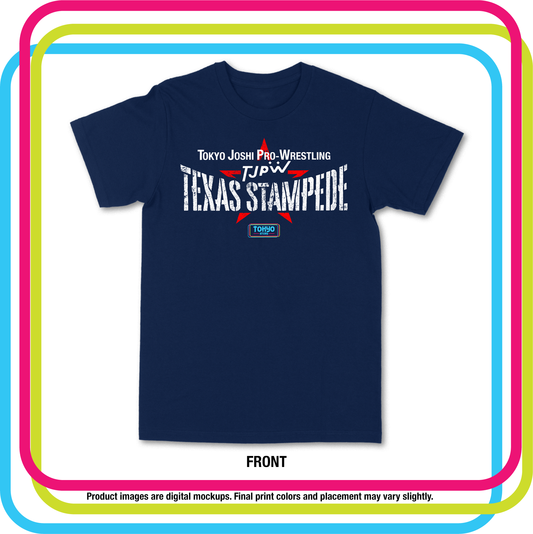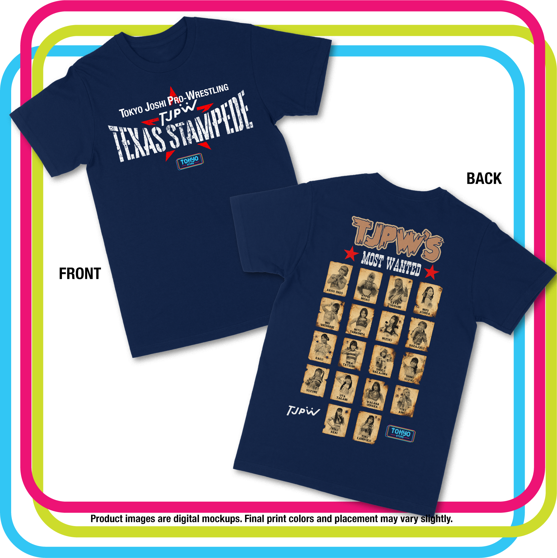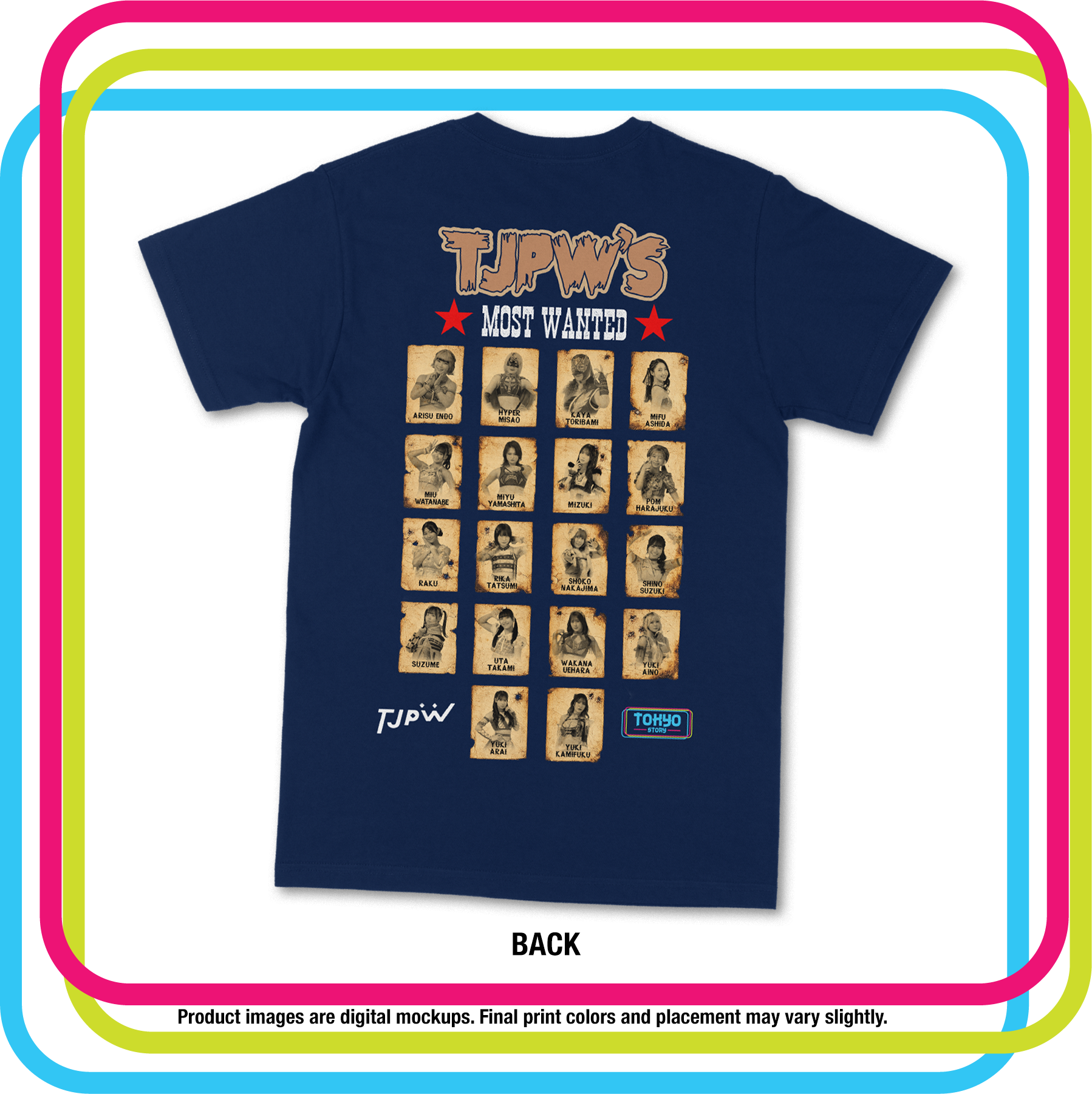 Featuring all 18 TJPW wrestlers in bold outlaw-style portraits on the back, with the official event logo on the front.